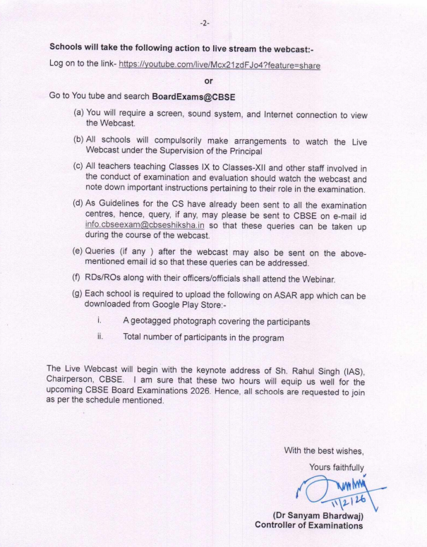 The Controller of Examinations, Dr. Sanyam Bhardwaj, has issued specific instructions. All affiliated schools must follow these steps to stream the webcast successfully.
