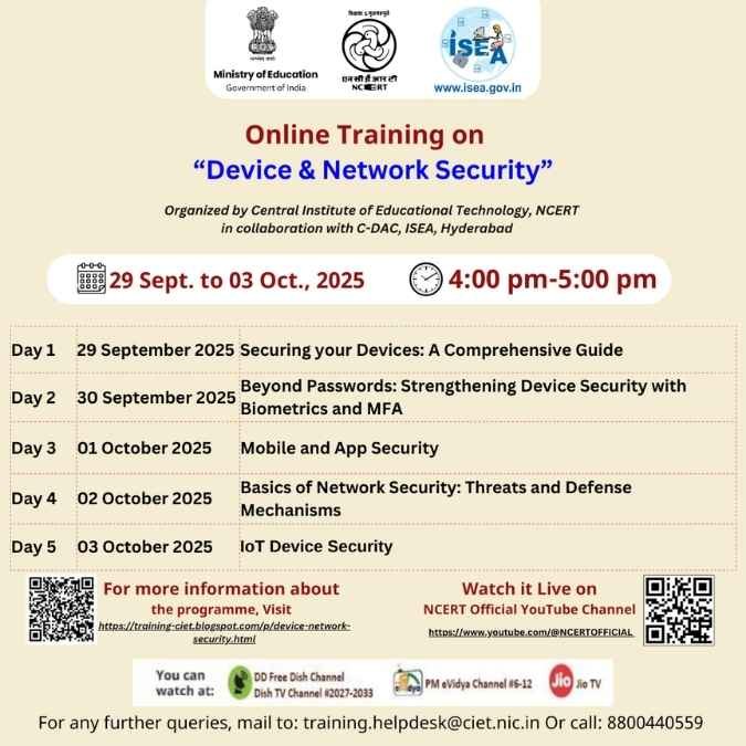NCERT-CIET has announced a five-day online training on “Device & Network Security” to strengthen the professional competence of teachers, school leaders, administrators, and all interested participants. The programme focuses on protecting digital infrastructures, preventing cyber threats, and ensuring safe online learning environments.